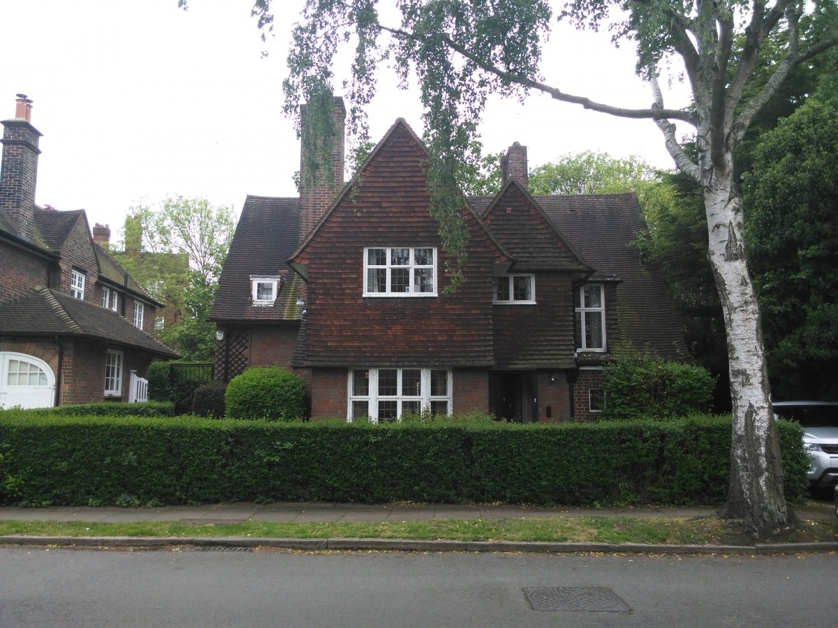 The detached house, built in 1924, is part of the Hampstead garden suburb, described as "the most nearly perfect example of that English invention and speciality, the garden suburb".