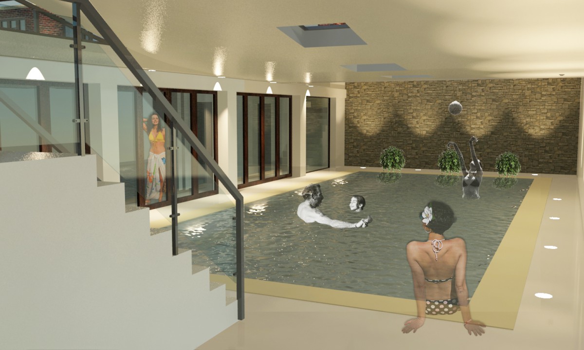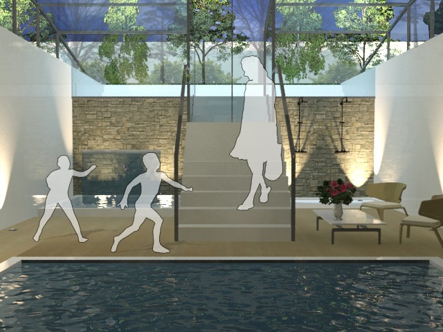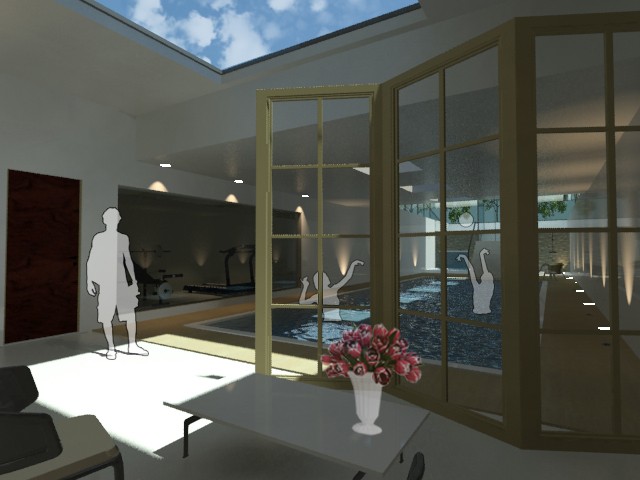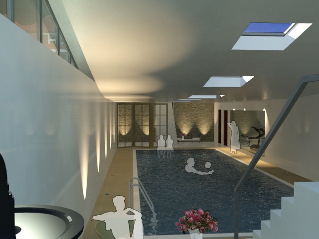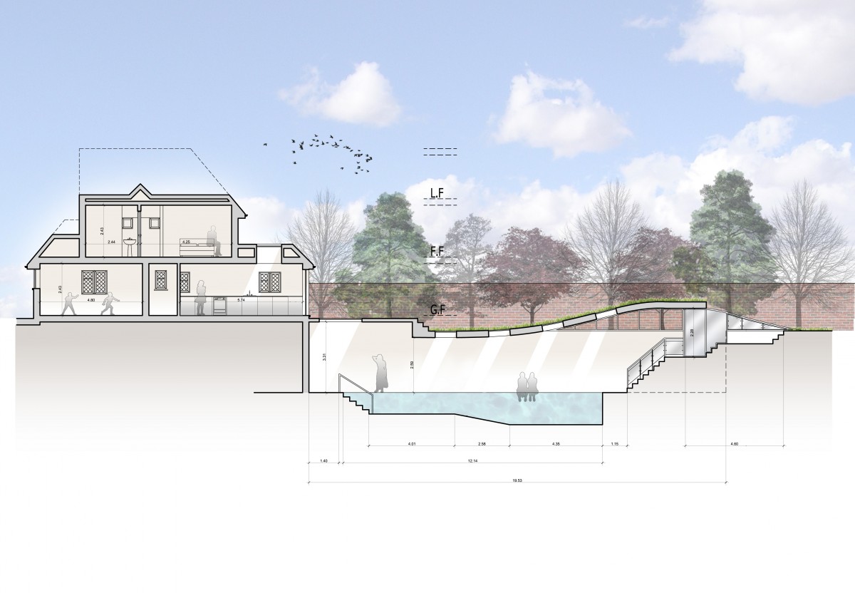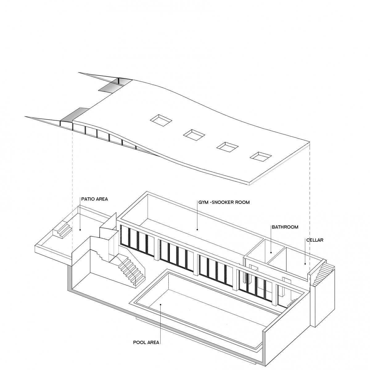 The basement housing the gym and swimming pool appears disconnected from the main house when viewed from the ground floor but it is connected to the house at basement level. The one end of the basement away from the house rises to ground level and emerges at the rear of the garden almost like an outdoor element of the garden. This was designed mainly to maintain the large garden keeping the original size and spender of the existing outdoors.